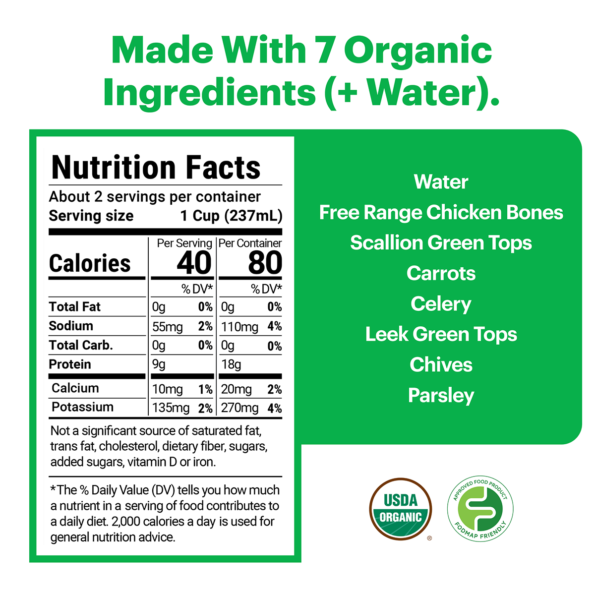 From humanely raised poultry to beautiful fresh vegetables, this product contains only 7 organic ingredients – chicken bones, scallion green tops, carrots, celery, leek green tops, chives and parsley.
